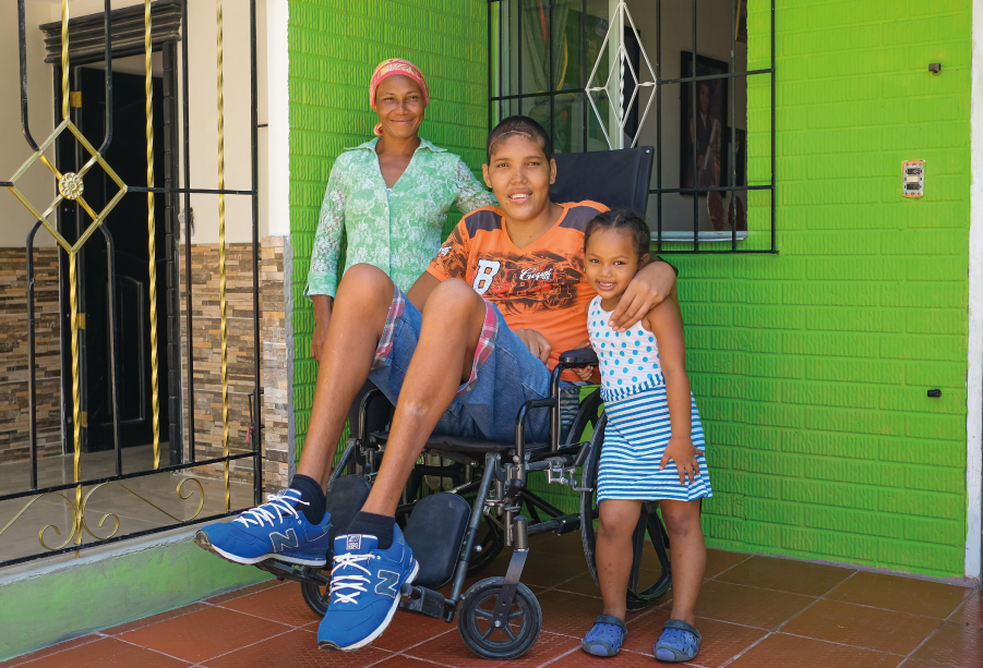 Cuando tenía alrededor de 10 u 11 años, Herneys comenzó a manifestar síntomas de constante fatiga y dolores en el cuerpo. “Nosotros vivíamos a las afueras del pueblo, en una parcela, y teníamos que buscar agua y leña para cocinar. Él (Herneys) nos ayudaba en esta labor, porque es mi único hijo varón, pero me decía en repetidas ocasiones que se sentía cansado”, relata Ingrid. Fue un problema digestivo el detonante para arrojar el diagnóstico definitivo. Así lo cuenta su mamá: “empezó a sentir un dolor frecuente en el estómago, los doctores decían que podía ser gastritis, pero yo sentía que no, porque él comía limón y tomaba gaseosa negra y café oscuro sin problema y, bueno, se supone que la gente con gastritis no lo tolera”. Tras varios controles médicos en su y ocho resonancias, en una de estas se evidenció “una masa extraña” con la que confirmaron la acromegalia, que en Colombia es considerada una enfermedad huérfana o rara porque tiene una prevalencia menor de 1 por cada 5.000 personas. Por ello, en 2015, a sus 16 años, fue necesario practicarle una cirugía en la cabeza. Esta consistió en la extirpación del tumor que causa la enfermedad y, a menudo, corrige la anormalidad de la hormona de crecimiento. Si este procedimiento no se realiza en una etapa temprana, la afección puede llegar a causar problemas graves e, incluso, la muerte. Luego de ser diagnosticado, Herneys, afiliado a Coosalud, recibió un tratamiento especial en su hogar, porque, de acuerdo con los especialistas, no era aconsejable que corriera, ni que levantara objetos pesados, pues una caída podía afectar considerablemente su estado de salud, teniendo en cuenta la fragilidad de sus huesos. Aunque la primera operación fue exitosa, en 2018 requirió otra intervención quirúrgica en una de sus piernas, con el fin de corregir una deformación ocasionada por su aumento de peso, sumado a su gran estatura y su sistema óseo débil. “Se engordó tanto que llegó a pesar 105 kilos. Entonces las piernas se le deformaron, se le pusieron en forma de X, por lo que se tomó la decisión de operarlo. A raíz de eso, como que le dio miedo, y tiene un año que ha dejado de caminar, no anda por sí solo, siempre lo hace con el caminador o con la silla de ruedas. Él se levanta, se para en las paredes, se apoya en la ventana, pero con el caminador, así se siente más seguro”, describe Ingrid.